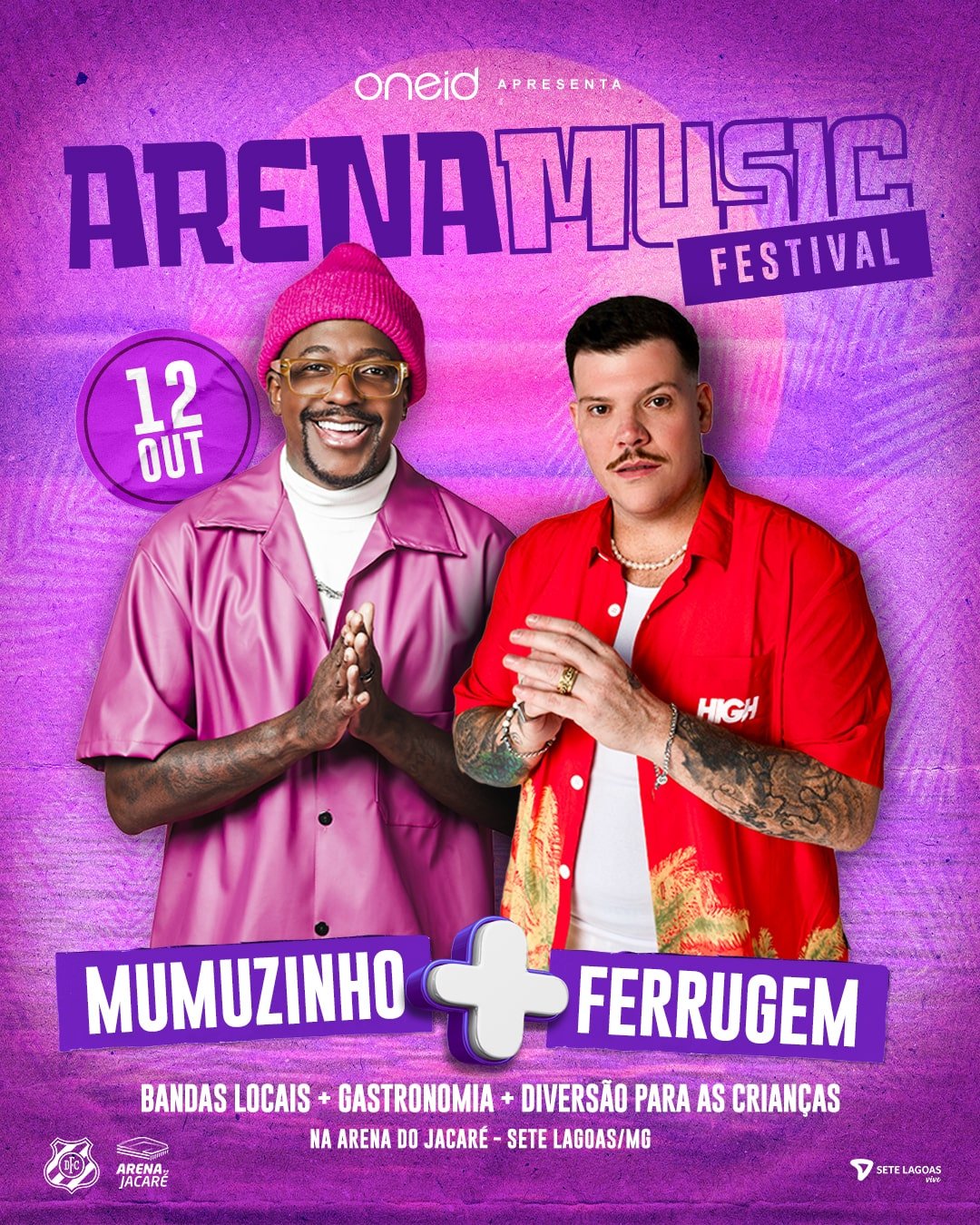 O Arena Music Festival vai trazer para Sete Lagoas dois dos principais cantores da atualidade, Ferrugem e Mumuzinho. Como o próprio nome diz, será um grande festival com 12 horas de duração. Estão na programação shows de artistas locais, DJ, uma vila gastronômica com biergarten para os amantes das melhores cervejas em uma experiência diferenciada e única.